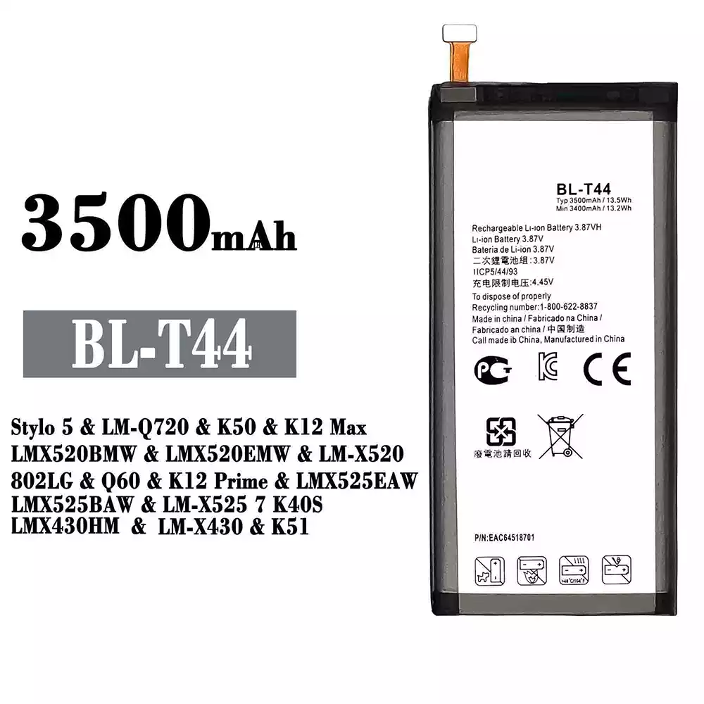 バッテリー BL-T44 対応 LG Stylo 5 / LM-Q720 / K50 / K12 Max / LMX520BMW / LMX520EMW / LM-X520 / 802LG / Q60 / K12 Prime / LMX525EAW / LMX525BAW / LM-X525 7 K40S / LMX430HM / LM-X430 / K51
