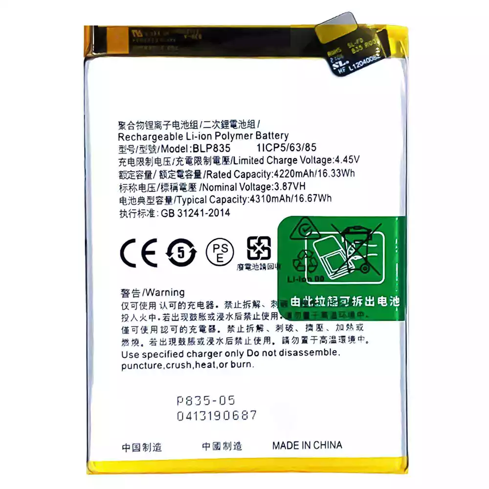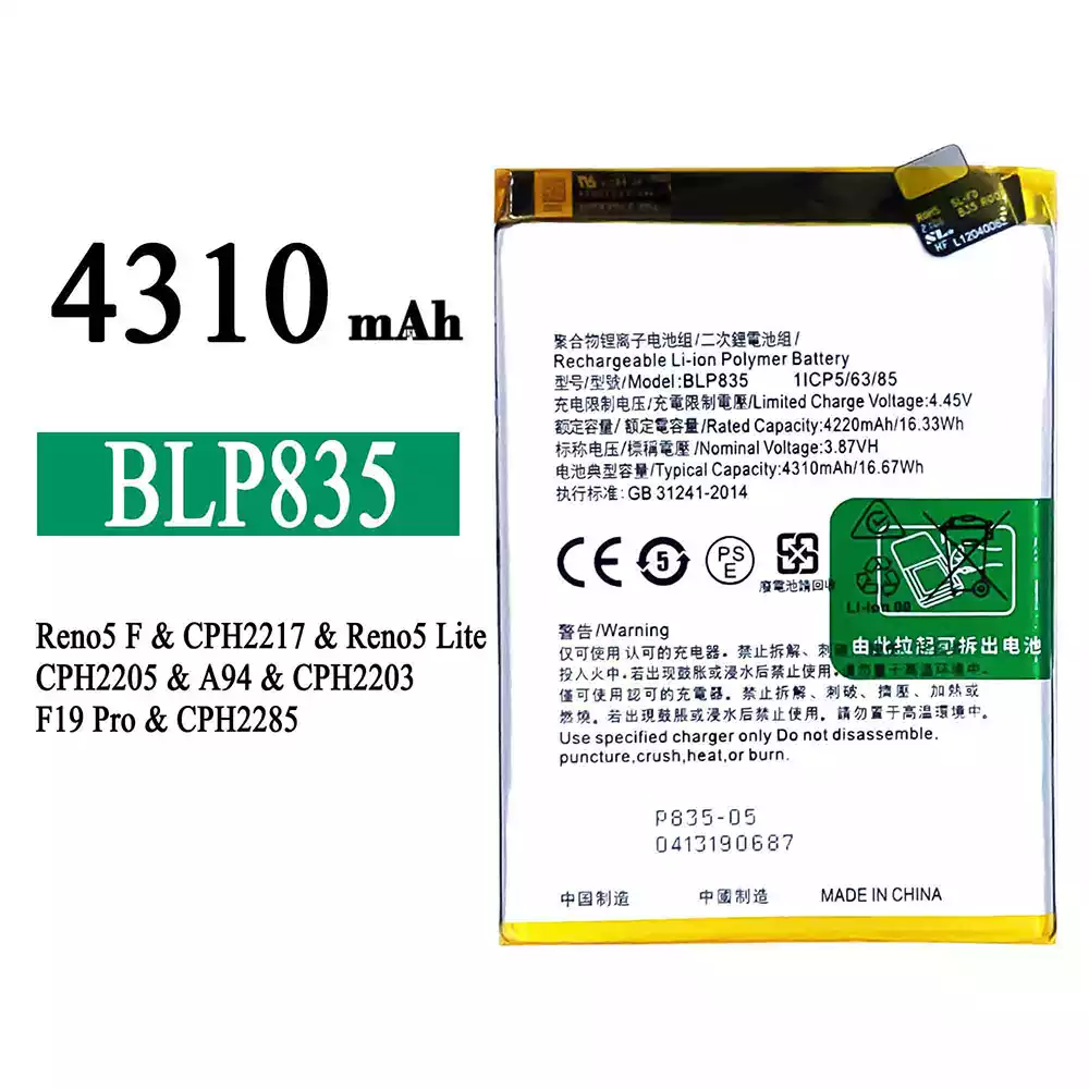 バッテリー BLP835 対応 OPPO Reno5 F /Reno5 Lite /F19 Pro /A94 4G /CPH2217 /CPH2205 /CPH2203 /CPH2285